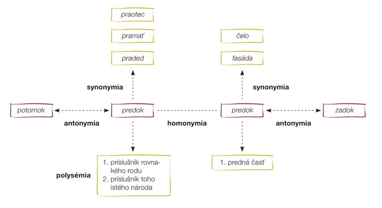 Synonymia je jav, keď sa jednému významu prideluje viac foriem - jedna vec, dej, jav atď. sa pomenúva viacerými inak znejúcimi slovami, napr. črievice, topánky, obuv. Synonymá sú rovnoznačné slová s rovnakým alebo blízkym významom. Absolútne synonymá sú slová s úplnou zhodou významu (napr. veľa - mnoho, rozprávať - hovorit). Čiastočné synonymá sú slová s podobným významom (napr. mladý - svieži, čistiť zemiaky - škriabať zemiaky). Synonymá vytvárajú synonymické rady, ktorých členy však nie sú rovnocenné. Dominantné slovo radu (dominanta) je zvyčajne štylisticky neutrálne, a preto najfrekventovanejšie, napr. kvetináč — kvetník — črepník — črep. Synonymické rady alebo dvojice slov s rovnakým alebo blízkym významom zachytáva Synonymický slovník slovenčiny. Slová zo synonymického radu si nevyberáme voľne, ale s prihliadnutím napr. na prostredie, v ktorom sa jazykový prejav realizuje, na autorský zámer ap.:
